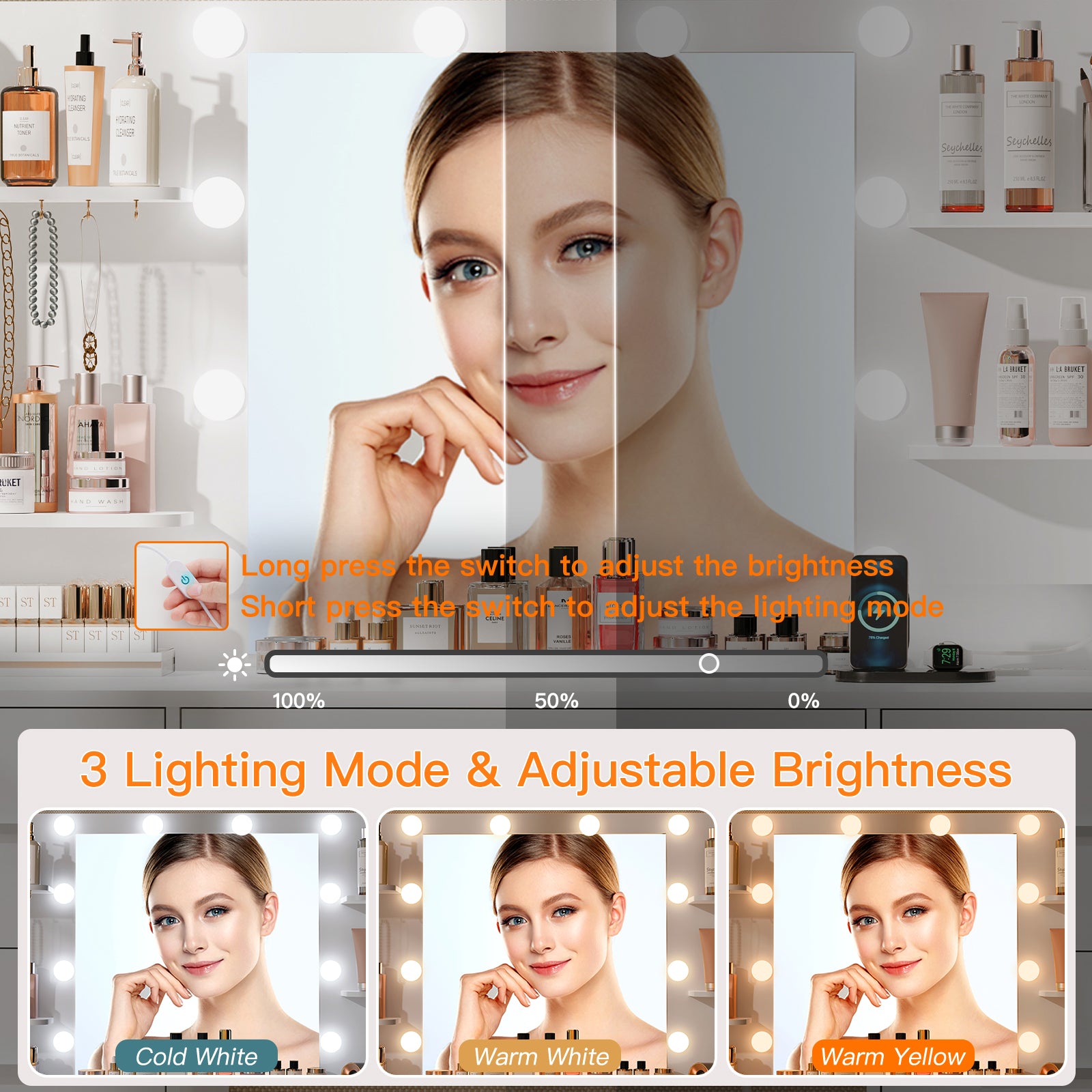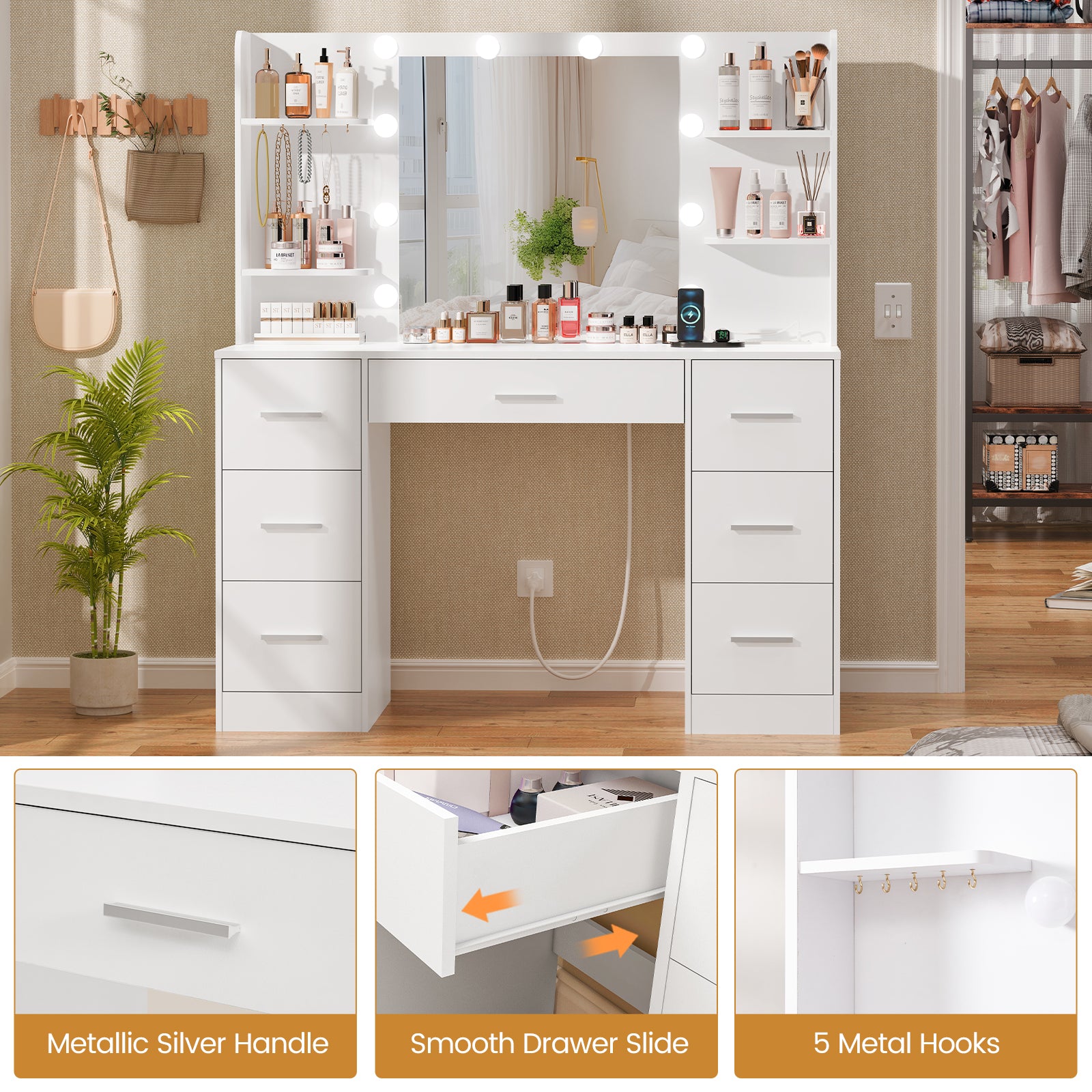 Plenty of Storage: Large table top with 7 Drawers and 6 open storage space, all of your makeup, hair and body products can fit and keeps them stored and safe. Our large vanity desk gives you tons of storage to keep everything put away & organized